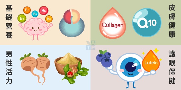 皮膚健康:膠原蛋白、榖胱甘肽、玻尿酸、蠶絲蛋白、余甘子、葡萄籽、玄米萃取、紅石榴、Q10等