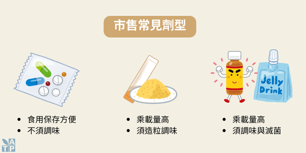市售酵素保健食品的型態可以分為「錠狀」、「硬膠囊」、「粉狀」、「飲料」、「果凍」等劑型。